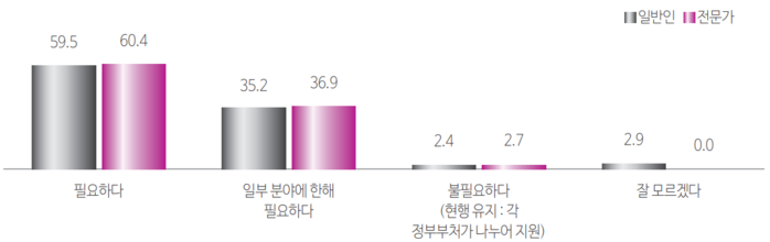특히 일반 국민 59.5%, 전문가 60.4%는 특별 조직이 필요하다고 응답했으며, 일반 국민 35.2%, 전문가 36.9%는 일부 분야에 한해 필요하다고 응답, 특별 조직이 불필요하다는 응답은 일반 국민 2.4%, 전문가 2.7%에 그친 것으로 나타났다.