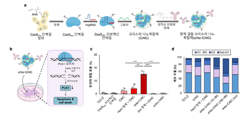 [mdtoday=김동주 기자] 최근 크리스퍼(유전자 가위) 기술을 활용한 유전자 교정 치료제 연구가 활발하다. 기존 화학적 항암치료제와는 달리 크리스퍼 기술 기반 유전자 교정 치료제는 질병 표적 유전자를 영구적으로 교정할 수 있어 암 및 유전 질환 치료제로 각광받고 있지만, 생체 내에서 암 조직으로 낮은 전달 효율과 낮은 효능으로 어려움을 겪고 있다.