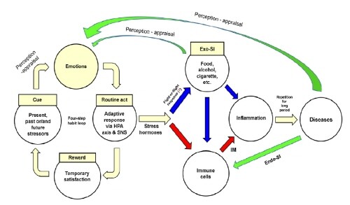 그림에서 질병발생의 시작(신호)은 삶 중 마주하는 스트레스 상황이다. 곧이어 분노·공포 등 부정적 감정을 유발하고, 특정행동(HPA axis와 교감신경을 활성화시켜 스트레스 호르몬 생성 후 신체 및 생리적 반응으로 진행)으로 이어진 후, 감정적 긴장의 해소라는 보상을 일시적으로 얻는다.