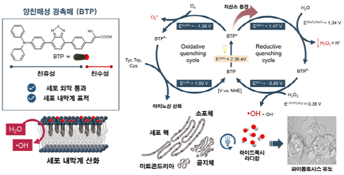 이번 연구에서는 전자 주개-받개 형태의 광감각제가 저산소 환경에서 강력한 활성산소종인 하이드록실 라디칼(Hydroxyl radical)을 생성하는 방법을 밝혀냈다. 광감각형 항암제는 약물의 내성을 극복하는 동시에 면역을 활성화하여 파이롭토시스가 암세포 사멸을 유도하는 것이다.