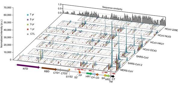 | ▲ 메르스 회복 후 7년간 다양한 코로나바이러스 스파이크 항원 부위들에 대한 항체 반응성 분석 결과 (사진=서울대학교 제공) |