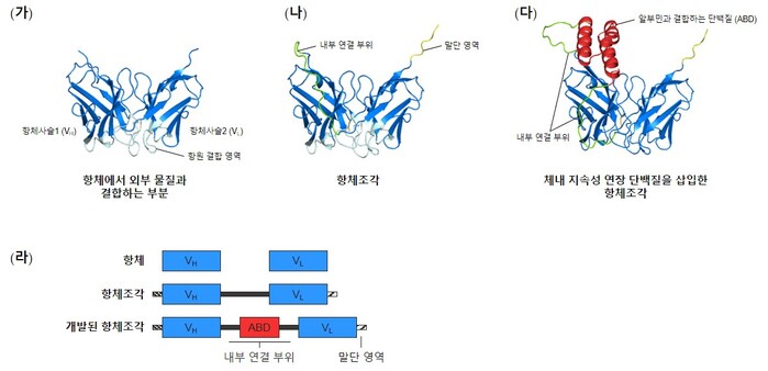 이전 연구들에서는 체내 지속성을 높이기 위해 알부민*과 결합하는 단백질을 항체조각의 말단 영역에 연결시켜 왔다. 연구팀은 이전에 시도되지 않은 항체조각 내부의 연결부위에 이를 삽입하는 구조를 설계했다.