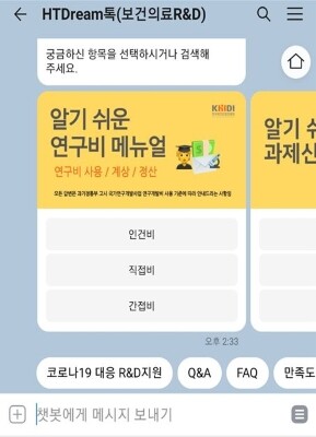 이번에 신설된 카카오톡 챗봇서비스는 진흥원 R&D 전문채널인 ‘HTDream톡(보건의료R&D)’을 방문해 사용할 수 있으며, 문의 빈도가 높은 ‘연구비 사용 및 관리’와 관련된 서비스를 고도화해 ‘과제신청 및 평가’ 및 ‘시스템 이용’ 등과 같은 새로운 분야에 대한 서비스를 추가 제공한다.
