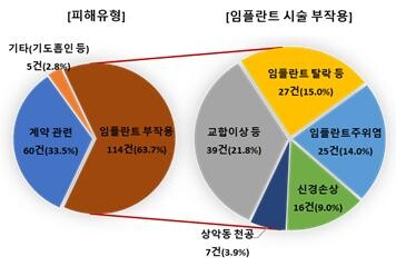 임플란트 관련 피해구제 신청 사유의 63.7%(114건)는 ‘부작용 발생’으로, 부작용 유형은 교합이상 21.8%(39건), 임플란트 탈락 15.0%(27건), 임플란트 주위 염증 발생 14.0%(25건) 등의 순이었다.