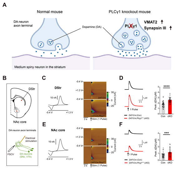 연구팀은 도파민 신경세포에서 PLCγ1 유전자를 불완전하게 만든 쥐 모델의 뇌 영역인 선조체와 측좌핵에서 도파민 분비가 증가한 것을 발견했다. 도파민 신경섬유 말단에서 VMAT2와 시냅신Ⅲ의 양이 증가했고, 이런 변화가 도파민 분비 증가에 결정적인 역할을 한다는 것을 밝혔다. 즉, 이번 연구를 통해 PLCγ1 단백질이 도파민 분비를 직접 조절한다는 사실이 처음 밝혀진 것이다.
