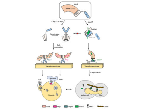 연구팀은 이러한 구조적 차이가 Vac8에 포함된 ARM 도메인과 N-말단의 H1 helix에 의한 조절임을 밝혀냈다. Vac8-Vac17의 복합체가 형성되면, Vac17이 Vac8의 H1 helix를 붙잡게 되고, H1 helix가 ARM도메인으로부터 분리되지 않게 만들어 자가포식을 일으키는 복합체(Vac8-Nvj1, Vac8-Atg13) 형성을 억제한다. 이는 세포분열 시, 자가포식이 억제되고 리소좀의 수송이 일어난다는 것을 의미한다.