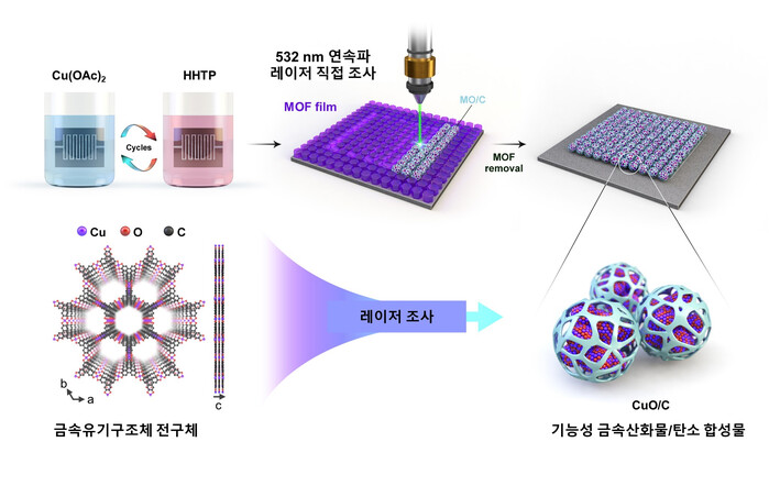 연구팀은 금속과 유기물이 규칙적으로 배열되어 있는 금속유기구조체에 미세 레이저 광열 공정을 수행하여 금속산화물/탄소 하이브리드 구조의 고성능 에탄올 센서 제작에 성공했다.