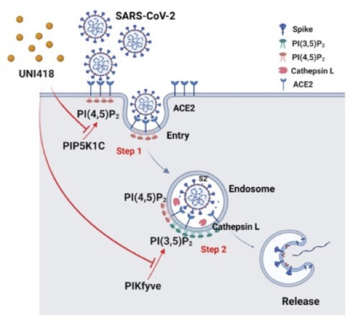 | ▲ UNI418이 세포내의 PIP5K1C와 PIKfyve를 저해하여 코로나바이러스 감염을 차단 (사진=UNIST 제공) |