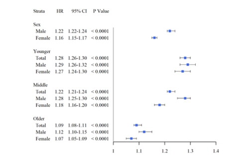 | ▲ 연령과 성별에 따른 외상성 뇌손상 이후 우울증 발생 위험 (그래프=국립교통재활병원 제공) |
