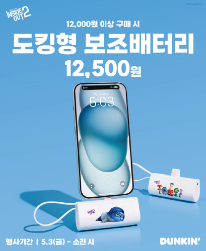 ‘인사이드 아웃2’ 테마의 도킹형 보조배터리 굿즈는 오늘부터 전국 던킨 매장에서 1만 2000원 이상 제품 구매 시 1만 2500원, 해피앱 바코드 스캔 시 7900원에 구입할 수 있다. 수량 소진 시 행사는 자동 종료하며 소진 시점은 점포별, 제품별 상이하다.