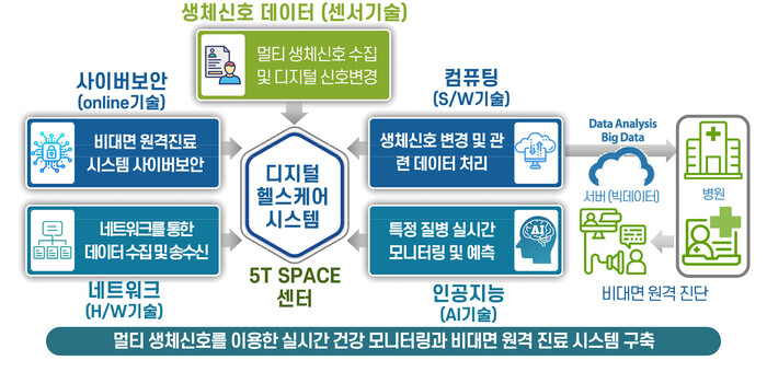 5T SPACE센터는 ‘하나의 웨어러블(wearable) 장치로 다중생체신호를 측정하고, 이를 기반으로 실시간 건강 모니터링과 원격진료’가 가능한 체계를 구축하고자 한다. 피부에 닿아도 불편하지 않도록 센서 소재를 개발하고, 측정된 여러 신호가 서로 뒤섞이지 않도록 인공지능 알고리즘을 설계하며, 개인정보 등의 보안 유지, 데이터 송・수신 등을 주요하게 다룰 예정이다.