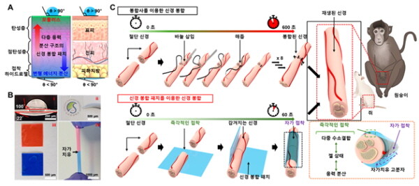 자가치유고분자의 물성을 조절해 탄성 고분자와 점탄성 고분자, 접착 하이드로젤을 단계적으로 배치, 점탄성 고분자가 응력을 흡수하고 탄성 고분자가 복원력을 부여하는 방식으로 강한 접착력을 구현했다.