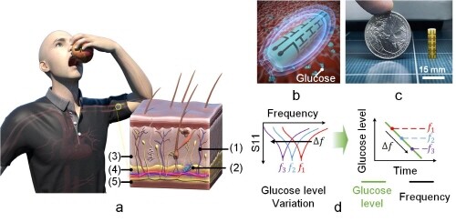 이 전자기파에 의한 변화와 연동된다. 센서가 작동하면 주변에 발생한 전자기파 영역은 유전율 변화를 감지한다. 제1저자인 김성문 UNIST 전기전자공학과 석・박사통합과정 연구원은 “만약 혈당이 높아지면 유전율이 낮아지는데, 이때 센서의 주파수는 높아진다”며 “이 점을 이용하면 실시간 혈당 측정도 가능하다”고 설명했다.