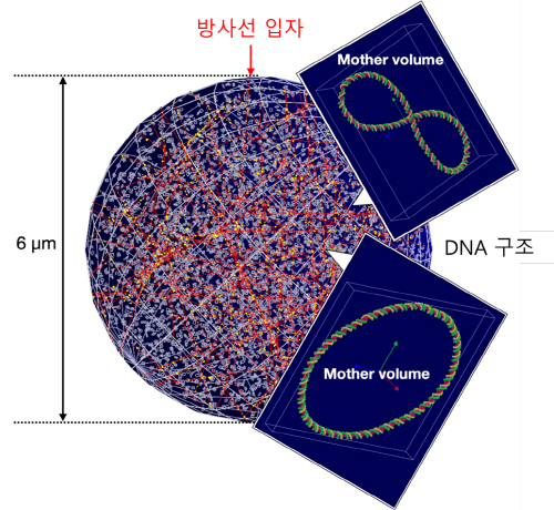 | ▲ 한국원자력연구원은 개발한 시뮬레이션 모델을 이용해 방사선 입자가 DNA 구조에 충돌하는 모습을 구현했다. (사진=한국원자력연구원 제공) |