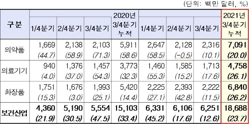 | ▲ 2021년 3/4분기(1~9월) 보건산업 수출액 (표= 한국보건산업진흥원 제공) |
