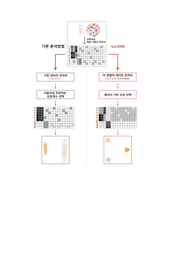기초과학연구원(IBS) 수리 및 계산 과학 연구단 의생명 수학 그룹 김재경 CI(Chief Investigator.KAIST 수리과학과 교수) 연구팀은 전사체 분석 빅데이터에서 유용한 생물학적 정보만 골라내는 새로운 도구인 ‘scLENS(single-cell Low-dimension Embedding using Effective Noise Subtraction)’를 개발했다고 9일 밝혔다.