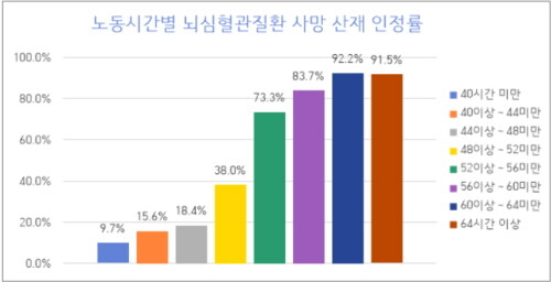 주 56시간 이상 60시간 미만, 60시간 이상 64시간 미만의 경우 과로사 산재 승인율은 각각 83.7%, 92.2%로 나왔다. 주 4시간 증가마다 산재 사망 인정률이 대략 10%포인트 증가하는 셈이다. 64시간 이상은 91.5%여서 주 60시간 이상과 큰 차이가 없었다.