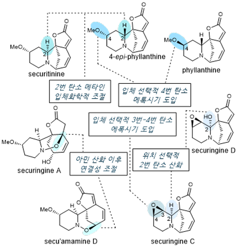 이번 연구를 통해 합성에 성공한 천연물로 세큐리티닌(securitinine), 세큐아마민(secu'amamine) D, 세큐린진(securingine) A, C, D, 필란틴(phyllanthine), 4-에피-필란틴(4-epi-phyllanthine)이 있으며, 이 중 필란틴을 제외하고는 모두 세계 최초의 합성이다.