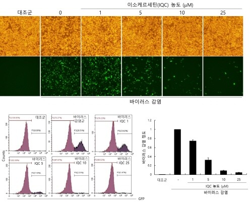 이번 연구에서는 세포 실험을 통해 이소케르시트린(Isoquercitrin)이 낮은 농도에서도 인플루엔자 바이러스 감염 초기에 바이러스가 세포에 부착하고 침투하는 단계를 저해하고, 바이러스를 직접 죽이는 효과가 있을 뿐만 아니라 세포 내에서 바이러스가 증식된 후 배출되는 단계에서도 억제하여 우수한 바이러스 치료 효능을 확인할 수 있었다.