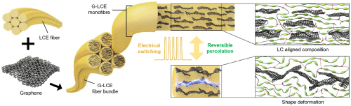 김 교수 연구팀이 개발한 신소재는 온도변화에 따라 동물 근육과 같이 크게 수축을 일으키는 액정물질에 고품질의 그래핀을 적용함으로써 레이저를 이용한 원격제어가 가능하며 인간 근육의 작업 수행능력(17배)과 출력밀도(6배)를 크게 능가하는 운동능력을 구현했다.