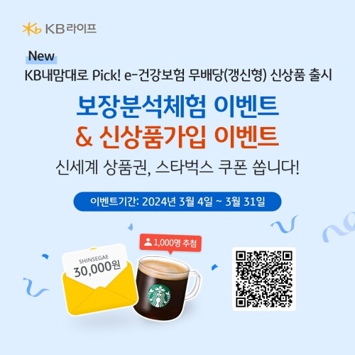 | ▲ KB라이프생명이 온라인 보험 상품 ‘KB내맘대로 Pick! e-건강보험 무배당(갱신형)’ 출시를 기념해 이달 31일까지 신상품 가입 이벤트와 보장분석 체험 이벤트를 동시에 진행한다. (사진=KB라이프생명 제공) |