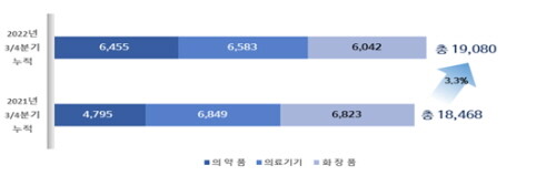 한국보건산업진흥원은 2022년 3/4분기 누적 의약품·의료기기·화장품 등 보건산업 수출 실적을 18일 발표했다.