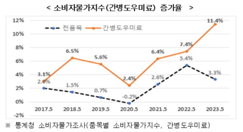 아울러 지난 5월 통계청 소비자물가는 1년 전에 비해 3.3% 올랐는데 간병비는 이보다 3배 이상 높은 11.4%가 올랐고 최근 5년간 소비자물가 대비 2~3배 높은 상승률을 보이고 있었다.
