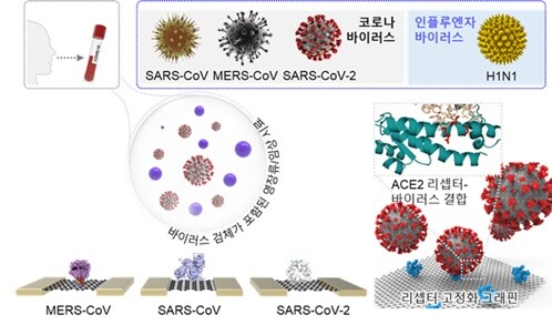 연구팀은 미세한 자극에도 패턴을 나타내는 다채널 트랜지스터를 기반으로 여러 종의 호흡기 바이러스를 선택적으로 검출할 수 있는 수용체와 함께 수용체의 신호를 간섭없이 그래핀에 전달할 수 있는 인터페이싱 화합물을 개발했다.