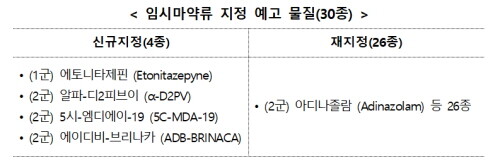 아울러 식약처는 현행 2군 임시마약류 중 오는 6월 27일 지정이 만료될 예정인 ‘아디나졸람’ 등 26종을 2군 임시마약류로 재지정한다.