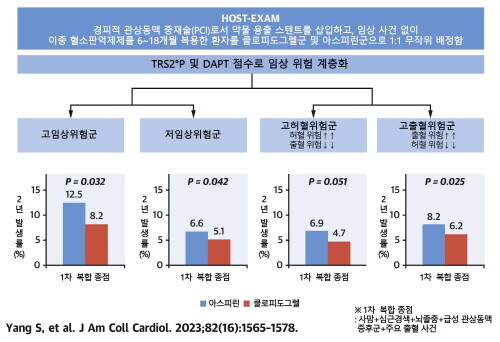 연구팀은 선행 연구(HOST-EXAM)에 등재된 환자 중 5,403명을 위험도에 따라 분류하고, 2년간 추적 관찰하여 클로피도그렐군과 아스피린군의 1차 복합 종점인 임상 사건(사망+심근경색+뇌졸중+급성 관상동맥 증후군+주요 출혈 사건) 발생률을 비교했다.