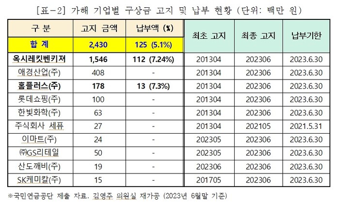 | ▲ 가해 기업별 구상금 고지 및 납부 현황 (표=김영주 의원실 제공) |