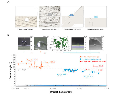 연구팀은 마이크로미터부터 밀리미터 크기를 포함한 비말의 젖음성 현상을 마스크 위에서 평가하고 비말의 크기가 작아질수록 섬유 표면에 의한 구조효과가 감소하여 물에 대한 접촉각이 작아짐을 규명했다. 접촉각이 급격하게 작아지는 구간에서는 물이 증발한 후 오염물 흡착이 증가했다.