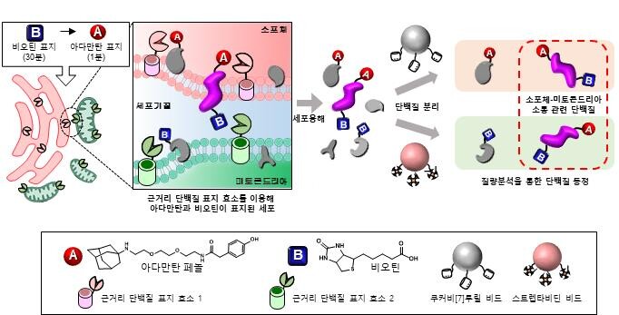 연구팀은 이번 연구에서 자연에서 유래한 결합 쌍인 비오틴-스트렙타비딘 시스템 외에, 이와 유사하게 강력한 결합력을 가진 인공 결합쌍인 아다만탄(Adamantane)- 쿠커비투릴(Cucurbituril) 시스템을 추가로 사용했다. 하나의 결합 쌍을 이용한 기존 연구와 달리 상호간섭 없는 두 결합 쌍을 사용해 두 소기관이 만나는 지점에 있는 단백질 표지·분석 능력을 혁신적으로 높인 것이다.