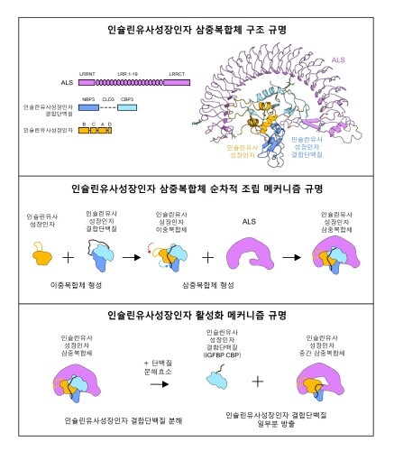 연구진은 인슐린유사성장인자 삼중복합체의 3차원 분자구조를 초저온투과전자현미경(cryo-EM)을 활용하여 규명하고, 각 구성요소 간의 상호작용을 밝혀냈다.