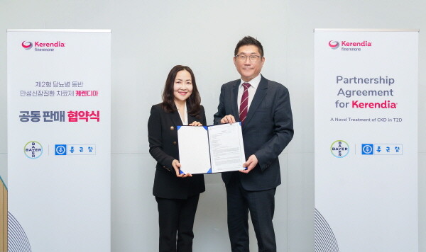 [mdtoday=김동주 기자] 바이엘 코리아는 종근당과 자사의 2형 당뇨병 동반 만성 신장병 치료제 ‘케렌디아’(성분명 피네레논)의 공동판매를 위한 파트너십 협약을 체결했다고 7일 밝혔다.