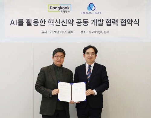 [mdtoday=김준수 기자] 동국제약은 지난 2월 29일 강남구 청담동 본사에서, AI 신약개발 플랫폼 기업 아론티어와 ‘AI 기반 첨단의약품 개발 공동연구’에 대한 협약을 체결했다.