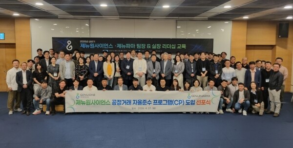 [mdtoday = 차혜영 기자] 국내 의약품 위탁개발생산(CDMO) 기업 제뉴원사이언스가 공정거래 법규 준수와 윤리 경영을 위한 내부통제 시스템 구축에 나섰다. 제뉴원사이언스는 지난 27일 본사에서 열린 전사 팀장 교육과 연계해 ‘공정거래 자율준수 프로그램(Compliance Program, 이하 CP) 도입 선포식’을 개최했다고 밝혔다.