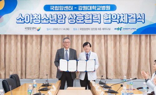 국립암센터와 강원대학교병원은 지난 14일 국립암센터 검진동 8층 세미나실에서 소아청소년암 진료체계 구축을 위한 상호협력 협약을 체결했다.