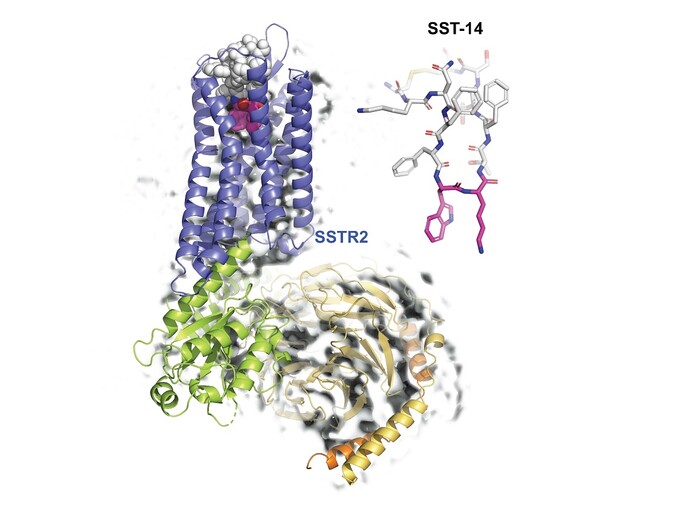 SSTR2은 세포막에 존재하는 막 단백질로, 세포 밖의 소마토스타틴을 신호로 인식해 세포 내로 전달하는 역할을 한다.