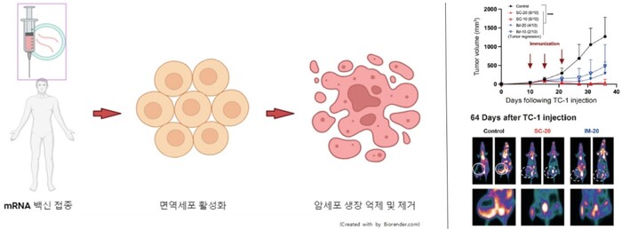 | ▲ (왼쪽) mRNA HPV 치료 백신의 작용 원리 (오른쪽) 자궁경부암 세포를 실험용 쥐에 이식한 후 국내 기술로 개발된 mRNA HPV 치료 백신을 접종한 결과, 실험용 쥐에서 자라던 암의 크기가 줄어들거나 완전히 사라짐을 암의 부피 변화, PET 단층 촬영기법으로 확인함 (사진=가톨릭대 제공) |
