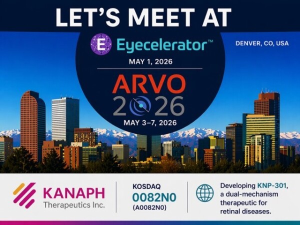 [mdtoday = 차혜영 기자] 카나프테라퓨틱스는 오는 미국안과학회(ARVO) 2026에서 황반변성 치료제 후보물질 ‘KNP-301’의 전임상 데이터를 공개한다고 29일 밝혔다. 이번 발표는 안과 분야 유망 기술을 소개하는 ‘Eyecelerator @ ARVO 2026’ 프로그램의 일환으로 진행된다.