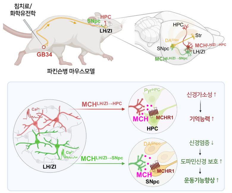 연구팀은 다양한 신경과학 실험을 설계·시행해 양릉천 침자극에 의한 치료 효과가 감각신경전달을 통해 시상하부의 MCH 신경세포가 활성화된 결과임을 확인했다. 연구 결과 MCH 신경세포가 최소 두 군집으로 나뉘며 각각 중뇌 흑질과 해마로 축삭돌기를 뻗어 신호를 전달함을 확인했다.