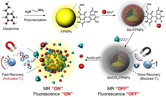 연구팀은 체내 신경전달물질인 도파민을 기반으로 형광물질을 새롭게 만들고, 여기에 망간염을 결합해 자기적 성질을 갖도록 했다. 체내 투입된 소재가 암과 같은 산성화된 환경과 만나면, 형광 이미지와 MR(magnetic resonance, 자기 공명) 이미지를 동시에 나타나게 해 보다 정밀한 진단이 가능했다.