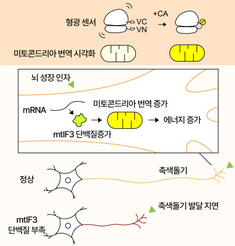 실험 결과 신경세포 말단에서 ‘mtIF3' 단백질을 합성하면 형광 센서에서 검출되는 형광 빛의 세기가 커졌다. 또 이 단백질을 억제했을 때는 신경세포 발달이 억제됐다. 이는 mtIF3 단백질이 미토콘드리아 번역을 활성화해 신경세포 발달을 조력한다는 증거다.