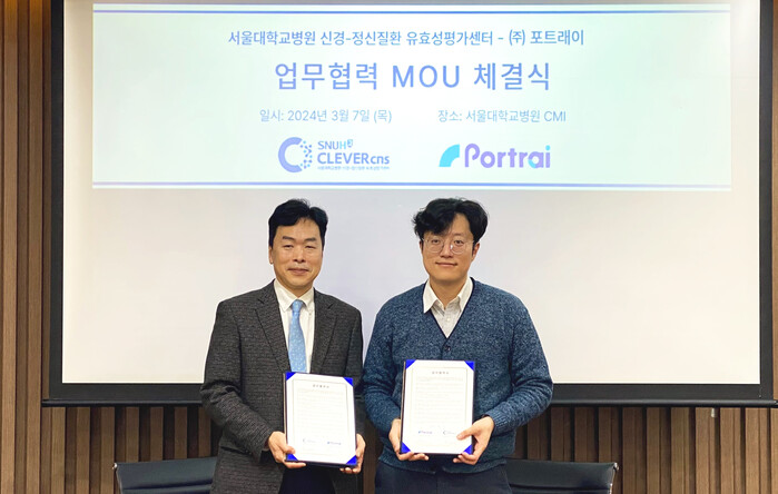 [mdtoday=이재혁 기자] 서울대병원 신경-정신질환 유효성평가센터(CLEVERcns)는 지난 7일 포트래이와 신약 개발 가속화 및 임상시험 성공률을 향상을 목표로 업무협력을 체결했다고 15일 밝혔다.