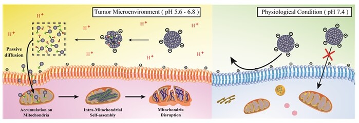[mdtoday=이재혁 기자] 암세포로 이뤄진 종양은 약산성(pH 5.6~6.8)을 띤다. 이 특성을 이용해 암세포를 사멸시킬 수 있는 항암 치료물질이 개발됐다. 이 물질은 종양 환경에서 끊어져 암세포로 침투한 뒤 미토콘드리아의 기능장애를 일으켜 암세포만 골라 죽인다.