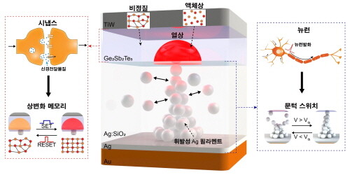이 교수 연구팀은 휘발성의 소자(threshold switch)로 뉴런을, 비휘발성의 상변화 메모리 소자로 시냅스를 모사해 단기·장기 기억이 공존하는 단일 뉴로모픽 소자를 개발했으며, 이를 통해 집적도 개선 및 비용 절감 효과도 얻을 수 있을 것으로 기대된다.