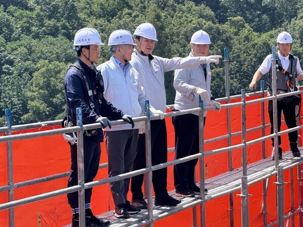| ▲ 디메드 구태훈대표(좌에서 세번째)가 관계자들과 준공중인 제3공장 및 R&D센터 진척사항을 살피고 있다. (사진= 디메드 제공) |