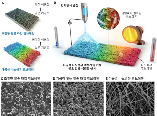 KAIST는 신소재공학과 김일두 교수 연구팀이 온도에 감응하는 색 변화 염료를 전기방사 기술을 통해 나노섬유 멤브레인(얇은 막)에 적용해 인간의 체온(31.6~42.7℃)을 색 변화를 통해 육안으로 손쉽게 감지할 수 있는 초고감도 센서 플랫폼을 개발했다고 30일 밝혔다.