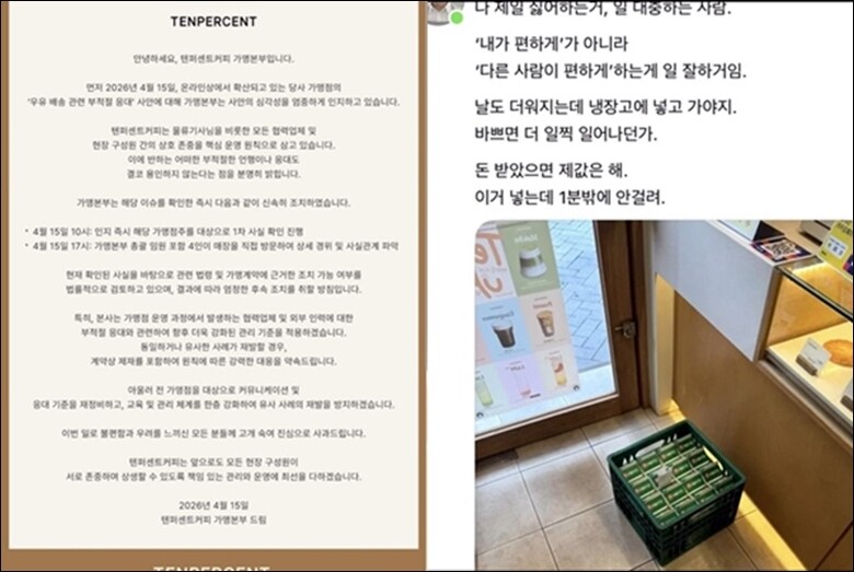 텐퍼센트커피 가맹본부는 16일 공식 소셜미디어(SNS)를 통해 “온라인상에서 확산하는 가맹점의 ‘우유 배송 관련 부적절 응대’ 사안에 대해 심각성을 엄중하게 인지하고 있다”고 밝혔다. 이어 “물류 기사를 비롯한 모든 협력업체 및 현장 구성원 간의 상호 존중을 핵심 운영 원칙으로 삼고 있으며, 이에 반하는 어떠한 부적절한 언행도 용인하지 않겠다”고 강조했다.